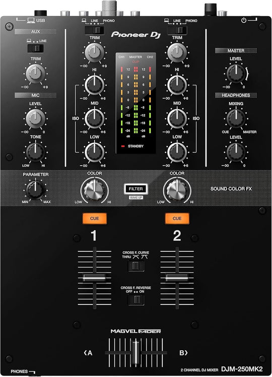 Pioneer DJ DJM-250MK2 DJ 2 Channel Mixer. 2-channel Digital DJ Mixer with 3-band Isolator EQs, Sound Color FX Filters, Replaceable Magvel Crossfader, USB Audio Interface, and rekordbox dj/DVS. The DJM-250MK2 has inherited some of the professional...Regular price $319.99 -