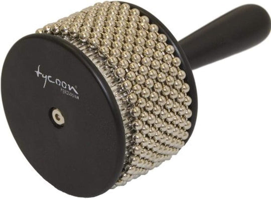 This cabasa is constructed with a ridged stainless steel shell surrounded by loops of steel-bead chains, producing rhythmic shaking and rattling sounds. Wooden flanges enclose the steel cylinder with a wooden handle attached to the bottom.Regular price $64.99