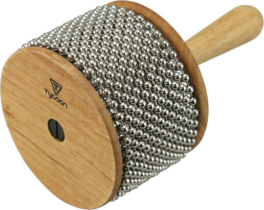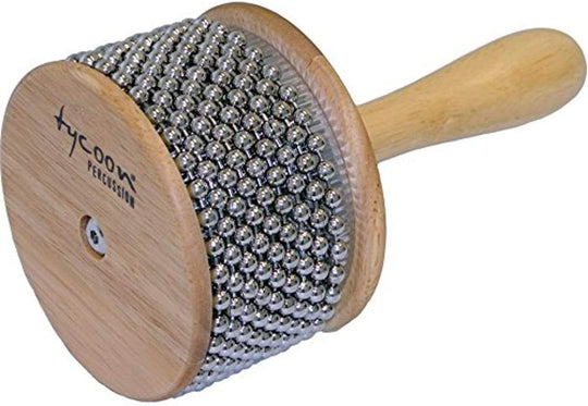 This cabasa is constructed with a ridged stainless steel shell surrounded by loops of steel-bead chains, producing rhythmic shaking and rattling sounds. Wooden flanges enclose the steel cylinder with a wooden handle attached to the bottom.Regular price $64.99 -