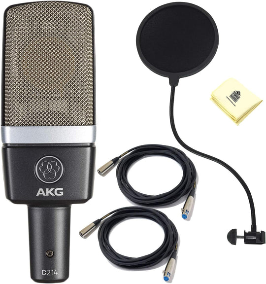 AKG Pro Audio C214 Professional Large Diaphragm Condenser Microphone (Grey) with POP Filter | 2 x Senor XLR Microphone Cables and Zorro Polishing Cloth