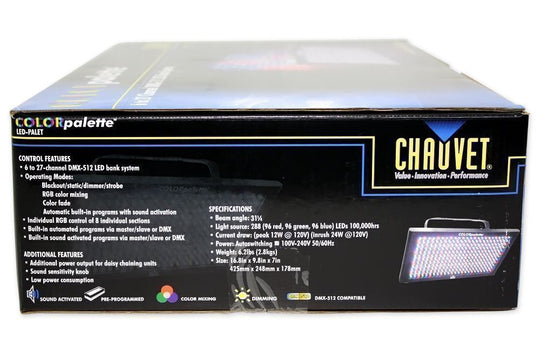 Chauvet LED COLORpalette Panel Stage Wash Light 6 to 27-channel DMX-512 LED bank system Blackout/static/dimmer/strobe and color fade operating modes 288 LEDs (96 red, 96 green, 96 blue) RGB color mixing and Individual control of 8...Regular price $159.99 -