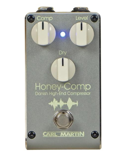 Welcome to the Honey Comp, and it's as sweet as ... well, you know ... honey. This pedal is the same as the Comp Limiter in every way... same Gray anodized finish, same footprint and the same simplicity of use with one compression control and one level control. It is pretty much the perfect compressor, so what could Carl possible upgrade? Easy! Carl added a Dry volume which allows you parallel processing with three knobs! Parallel Processing is a studio technique which takes a heavily compressed signal (which through compression loses some dynamics if not all) and allows you to add a clean (Dry) signal on top replacing those dynamics giving your guitar three-dimensionality and allowing the guitar to cut through the mix. For those of you used to studio work, this is a very well-known technique, but usually too complex for a pedal board! The three knobs allow you to balance the Compressed signal with the Dry signal quickly and efficiently for a very pro sound!