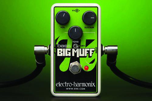 The huge Bass Big Muff sound now in a nano-sized package. Voicing inspired by the tank green Russian Big Muff with the classic Big Muff Pi layout of Sustain, Tone and Volume controls. Controls for Volume, Tone and Sustain let you sculpt your distortion and drive, while the Dry switch mixes your dry bass with the EHX Nano Bass Big Muff's distortion.