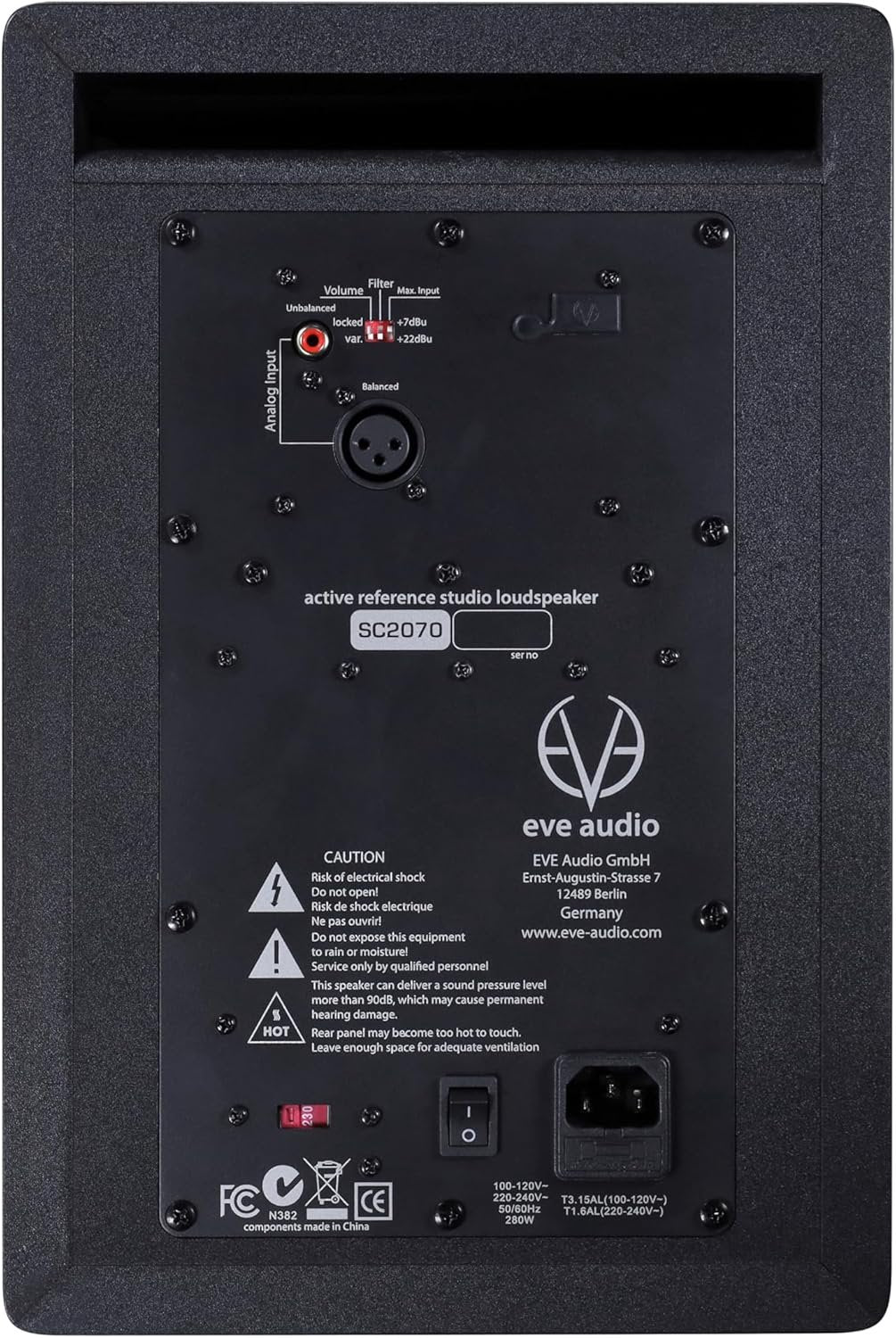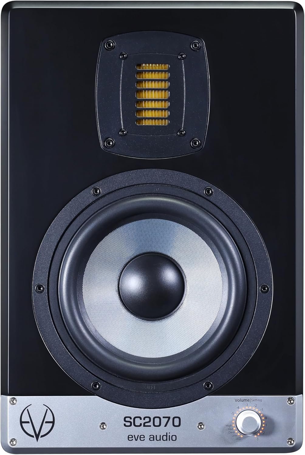 The SC2070 utilizes a newly developed Air Motion Transformer RS7, which is the largest AMT used in a 2-way monitor. This AMT allows for exceptionally detailed resolution of high and upper mid frequencies, making this monitor the perfect tool for mid-sized professional recording studios as well as home studios where quality is paramount. The SC2070 combines the eminent technologies of the SC3070 and the TEC Award-winning SC4070 in a compact 2-way system. The brand-new Air Motion Transformer RS7 represents a new level of innovation. RS7 has been specifically developed for SC2070 to achieve a crossover frequency at 1800Hz that is astonishingly low for a 2-way monitor. The diaphragm area is 1.5 times larger than that of the tweeter's membrane used in SC207. High and upper midrange frequencies are reproduced with unparalleled precision and resolution, revealing smallest nuances. An optimised, low-resonance enclosure with a reinforced front baffle houses the Air Motion Transformer RS7 and a 6.5" SilverCone woofer, as well as the amplifier unit with a total output power of 250W. Intelligent protection mechanisms prevent the drivers from overload. The bevelled cabinet edges reduce sound diffractions. All adjustments can be made via the SMART-knob, which is a trademark of all EVE Audio studio monitors. Thus, a variety of improvements to the respective room situations can be made in the easiest way possible from the front of the studio monitor. On the strength of the combination of these technologies, the SC2070 offers unmatched performance for its compact size with maximum impulse fidelity.