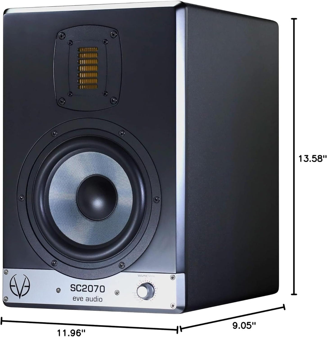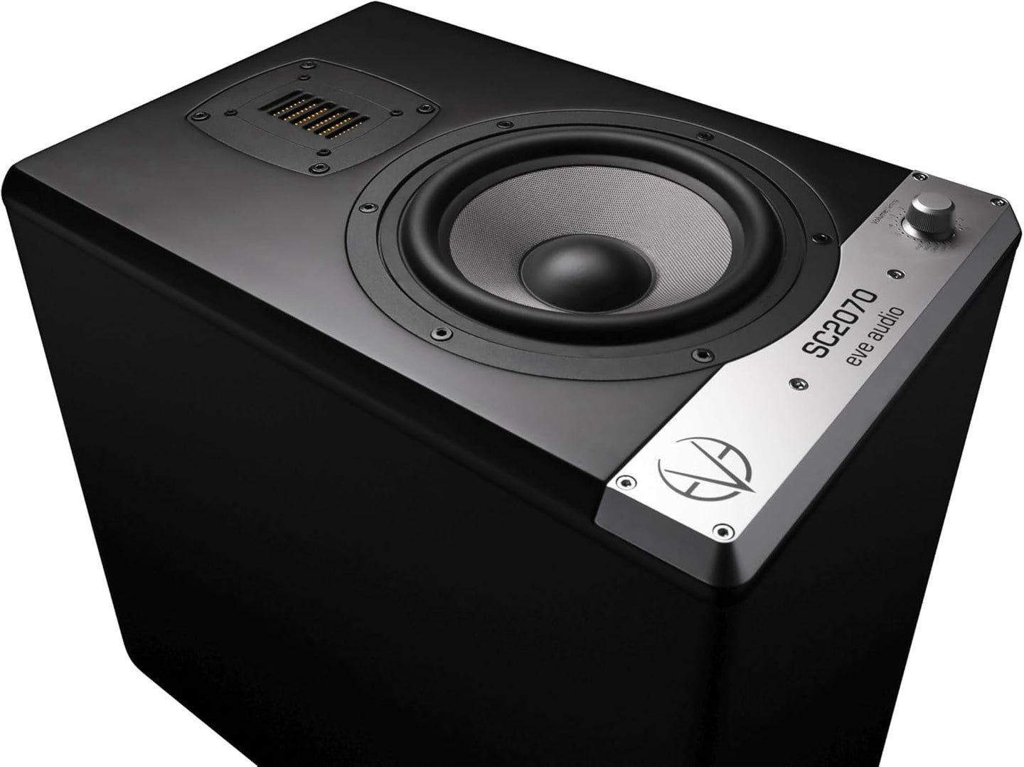 The SC2070 utilizes a newly developed Air Motion Transformer RS7, which is the largest AMT used in a 2-way monitor. This AMT allows for exceptionally detailed resolution of high and upper mid frequencies, making this monitor the perfect tool for mid-sized professional recording studios as well as home studios where quality is paramount. The SC2070 combines the eminent technologies of the SC3070 and the TEC Award-winning SC4070 in a compact 2-way system. The brand-new Air Motion Transformer RS7 represents a new level of innovation. RS7 has been specifically developed for SC2070 to achieve a crossover frequency at 1800Hz that is astonishingly low for a 2-way monitor. The diaphragm area is 1.5 times larger than that of the tweeter's membrane used in SC207. High and upper midrange frequencies are reproduced with unparalleled precision and resolution, revealing smallest nuances. An optimised, low-resonance enclosure with a reinforced front baffle houses the Air Motion Transformer RS7 and a 6.5" SilverCone woofer, as well as the amplifier unit with a total output power of 250W. Intelligent protection mechanisms prevent the drivers from overload. The bevelled cabinet edges reduce sound diffractions. All adjustments can be made via the SMART-knob, which is a trademark of all EVE Audio studio monitors. Thus, a variety of improvements to the respective room situations can be made in the easiest way possible from the front of the studio monitor. On the strength of the combination of these technologies, the SC2070 offers unmatched performance for its compact size with maximum impulse fidelity.