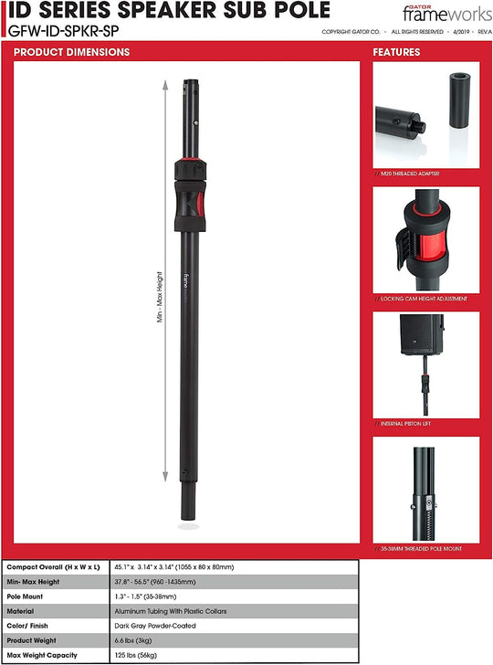 Gator Cases GFW-ID-SPKR-SP Frameworks ID Speaker Sub Pole with Piston Driven Height Adjustment & Adapter