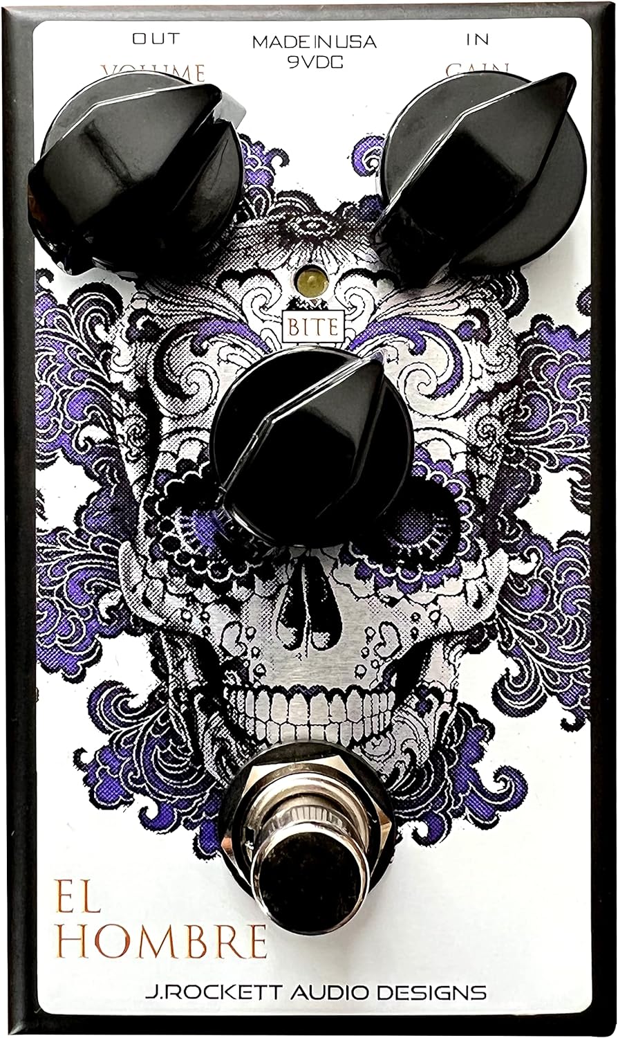 The El Hombre is simple in format but complex in its abilities. The tone section is very effective allowing you to alter the drive style simply by adjusting the "Bite" control. When you bring the bite control up (Clockwise) it becomes more aggressive, turn it down (counter clockwise) making it smoother and more reminiscent of Dumble tones. Please experiment because there is a myriad of sounds in such a simple pedal. Push the volume up and bring the gain back for some amazing blues tones, push the gain and drop the volume for the smooth Carlton/Ford sounds. Bring the "Bite" control up and get wide open Plexi sounds. We are confident that this pedal can achieve any tone you need which is why we love it so much.