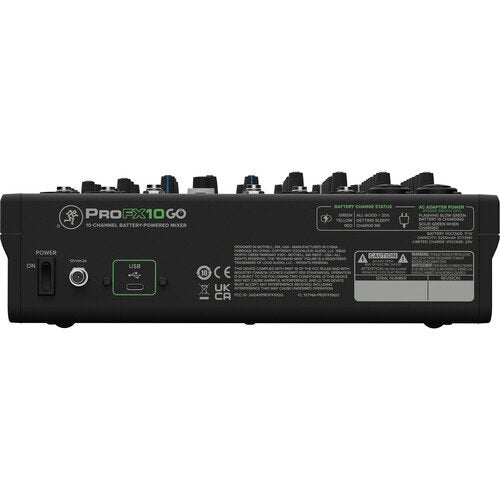 Mackie ProFX10 GO is a professional analog mixer and USB-C audio interface that can run on a rechargeable, swappable battery for up to 8 hours, so you're always ready to mix on the GO. ProFX10 GO gives you up to 8 hours of professional mixing and recording on a single charge with the included GB-10 battery. It's the best way to get quality live sound for remote gigs and outdoor events.