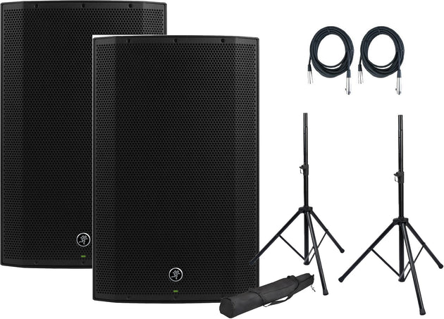 Pair of Mackie THUMP 15 Speakers with Speaker Stands and Travel Bag