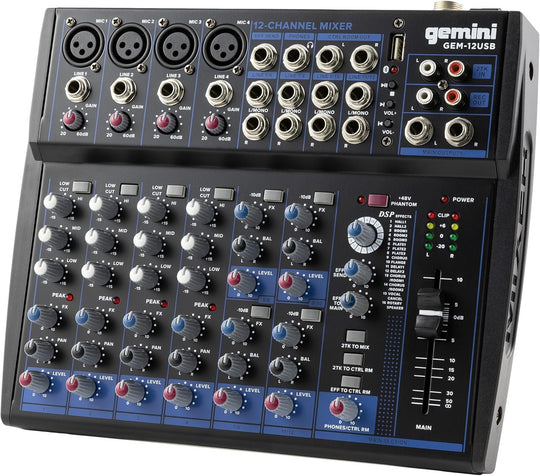 Gemini GEM-12USB Compact 12 Channel Bluetooth Audio Mixer With USB - Bluetooth Direct Streaming, 12 Ins, 2 Bus, 3 Band EQ, 16 Internal effects