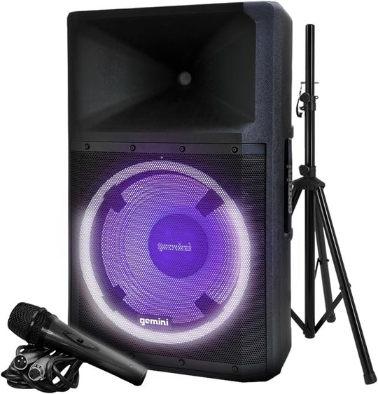 Gemini GSP-L2200PK Built in LED light show, 2200 watt Peak Power, Class AB Bi-Amp powered 2-Way 15” full range loudspeaker, 3-channels, Bluetooth streaming, Stereo pairing, Stand & Microphone included