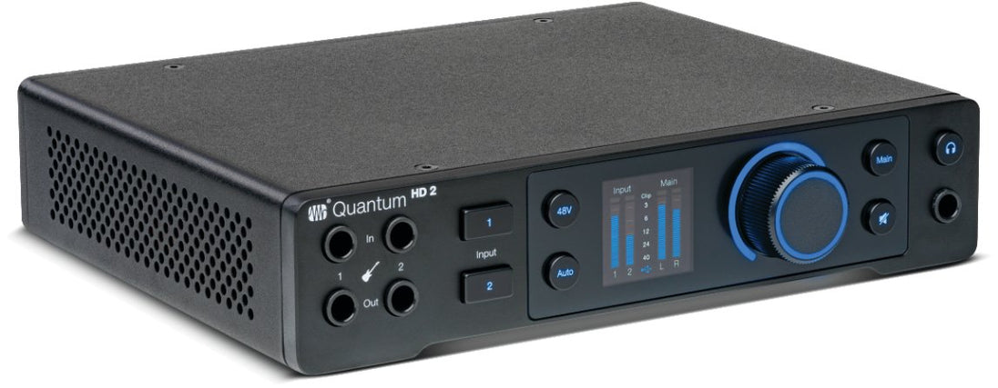 The Quantum HD 2 features two newly designed high-definition MAX-HD mic preamps with +75 dB of gain – making it ideally suited for today's most popular microphones. Guitarists and bassists will love the two instrument inputs, which were co-developed with Fender engineers. You also get the two-re-amp outputs so you can send audio from your DAW to your guitar or bass amp and re-record it to experiment with different amps, pedals, and mic placements. An illuminated push encoder provides flexible control over gain level and output volume, making it great for self-produced recording.