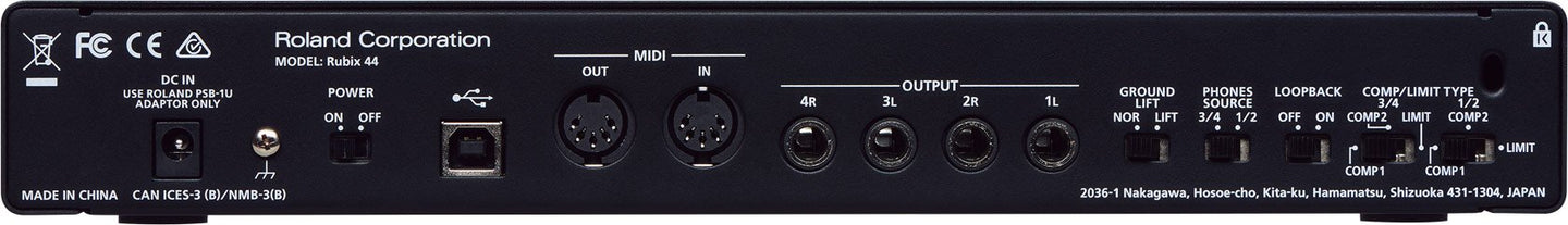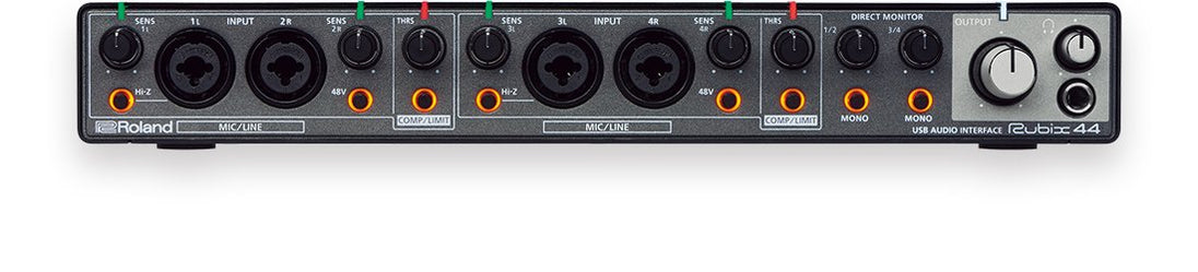 Roland RUBIX44 USB Audio Interface, 4 in/4 out. Rubix44 offers a perfect balance of high-fidelity sound, solid build quality, compact size, affordable price, and crucial features for today's musicians and producers. With support for high-resolution audio up to 24-bit/192kHz, Rubix44 sounds clear and defined and is carefully engineered to have extremely low noise from input to output. Its near universal USB support means it works seamlessly with Mac and PC computers, and even supports iPads, for the ultimate in portable music production and performance.