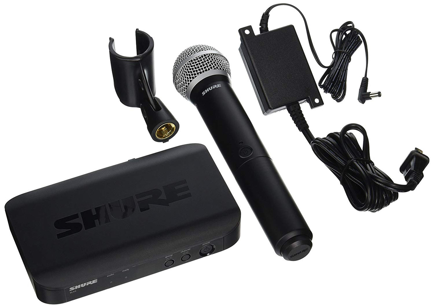 Included: BLX4 wireless receiver; BLX2/PG58 handheld transmitter with integrated PG58 cardioid dynamic microphone capsule; microphone clip
