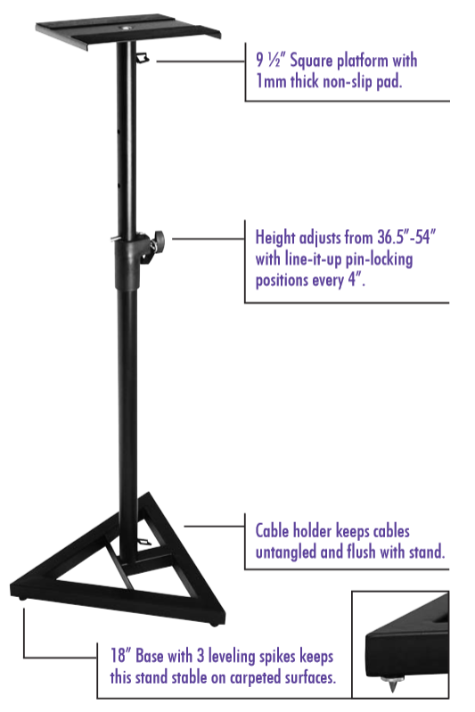 OnStage SMS6000 Adjustable Studio Monitor Stand (Pair)This stand (pair) is designed with home and project recording studios in mind. The height adjusts for listening sitting or standing and will lock in place with a security pin....Sale price $136.95Regular price $180.99