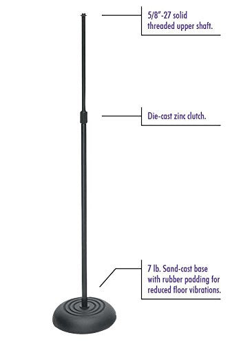 On Stage MS7201B Round Base Microphone Stand, Black Solid cast end with standard 5/8-27 threads Die-cast zinc clutch locks stand height in place from 34 - 60 inches. Internal counter clutch mechanism holds upper shaft in...Sale price $37.95Regular price $38.00 -