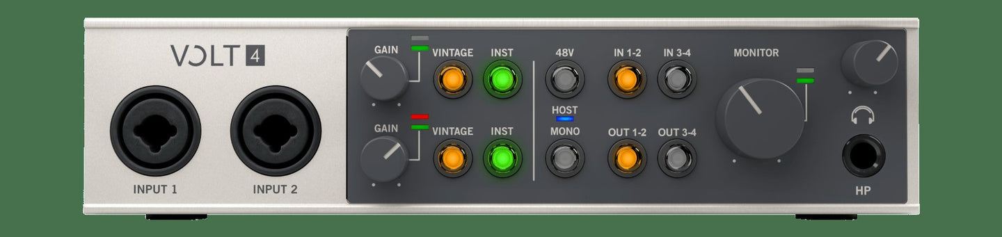 Volt 4 is the perfect audio interface for creative collaborators who want to easily record audio projects with professional studio sound. Plug right into your Mac, PC, iPad, or iPhone and Volt just shows up, ready to capture your inspiration with professional sound, courtesy of Universal Audio. From the team that brought you the game-changing Apollo interface, Volt 4 delivers superior studio sound quality with more character and tone than any USB interface in its class. Few sounds can compare to a vintage Universal Audio 610 tube preamp, the same preamp used to record everyone from Ray Charles to Van Halen. Volt 4 gives you the rich, full sound of this iconic UA preamp, thanks to its built-in tube emulation circuitry, a UA exclusive. Start creating music with the best gear ever made using UAD Spark, an ever-expanding library of world-class plug-ins and instruments for a low monthly price. UAD Spark plug-ins run natively on Mac and will give your recordings the professional analog tones heard on your favorite albums. Volt 4 gives you simple 4-in/4-out audio connections. Just plug your mics and guitars into the front panel preamps, and use the line inputs for synths and drum machines. Then connect your speakers or headphones to monitor your audio with no latency. With Volt, you’ll be creating like a pro, fast. Traveling light? Plug Volt 4 into your iPad or iPhone, and you can easily create beats and samples, record your band’s rehearsals, and edit songs anywhere. Start creating right away with a bundle of professional music production tools, virtual instruments, and plug-ins including Ableton, Melodyne, UJAM’s Virtual Drummer, Marshall, Ampeg, and more. Featuring rugged all-metal construction and sleek, vintage-inspired industrial design, Volt 4 elevates your production space with impeccable style, built to last decades.