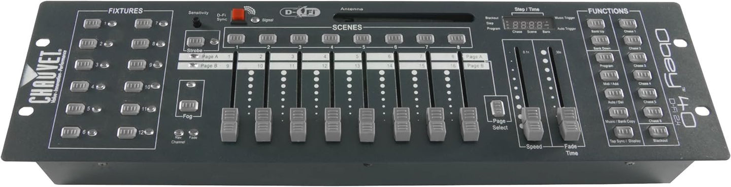 The Obey 40 D-Fi 2.4 is a small, but full-featured lighting controller with a built-in D-Fi transmitter so you can built a rig without long DMX cable runs! The Obey 40 D-Fi 2.4 works with any D-Fi compatible product and controls up 12 different types of lights. It stores scenes and chases for playback, and it operates lights “on the fly”. The stored scenes and chases are triggered by sound, or manually adjusted, to get just the right speed and fade time for your look. The Obey 40 D-Fi 2.4 is MIDI compatible and has dedicated fog and strobe controls. The Obey 40 D-Fi 2.4 is the perfect board for creating a dazzling light show without long cable runs!