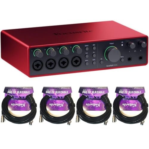 Offering a powerful combination of high-quality sound and user-friendliness in a compact and portable format for recording, podcasting, and streaming, the Focusrite Scarlett 18i16 (4th Generation) 18-in / 16-out USB-C audio/MIDI interface lets musicians, producers, and creators capture high-quality audio with no learning curve, no matter where they go. The 4th Generation model features four ultralow-noise microphone preamps with up to 69 dB of gain to capture the full potential of your mics. The flagship, RedNet 24-bit / 192 kHz AD/DA converters provide a huge dynamic range up to 122 dB, matching the quality you'd find in a pro studio. The new Auto Gain mode automatically sets your recording level, and the Clip Safe mode automatically prevents your signal from clipping, ensuring every take is a keeper. The Loopback feature lets podcasters, gamers, YouTubers, and streamers mix audio from other apps running on the computer. The 18i16 4th Generation works in standalone mode without a computer, useful for live performances or monitoring-only situations. Bundle with Kellards XLR-P20T Pro 20 ft XLR Microphone Cable Mixers, Recording Studios, and Podcasts - Black (4 Pack) What's in the box