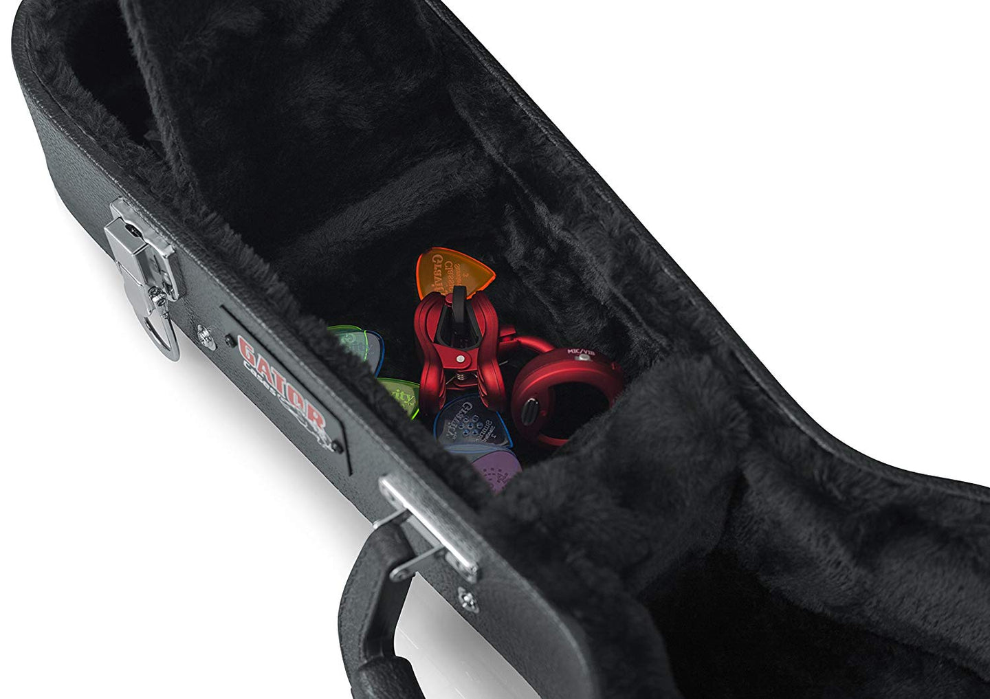 The form-fitting interior and plush lining keeps it safe from dings, dents, dust and debris. A built-in storage compartment provides storage for picks, tuners, and accessories and adds extra support for the neck and headstock. The ergonomic handle and chrome plated, lockable latches keeping everything secure. Whether used for regular storage or traveling around town, the GWE-UKE-CON case from Gator is the best option at an affordable price.
