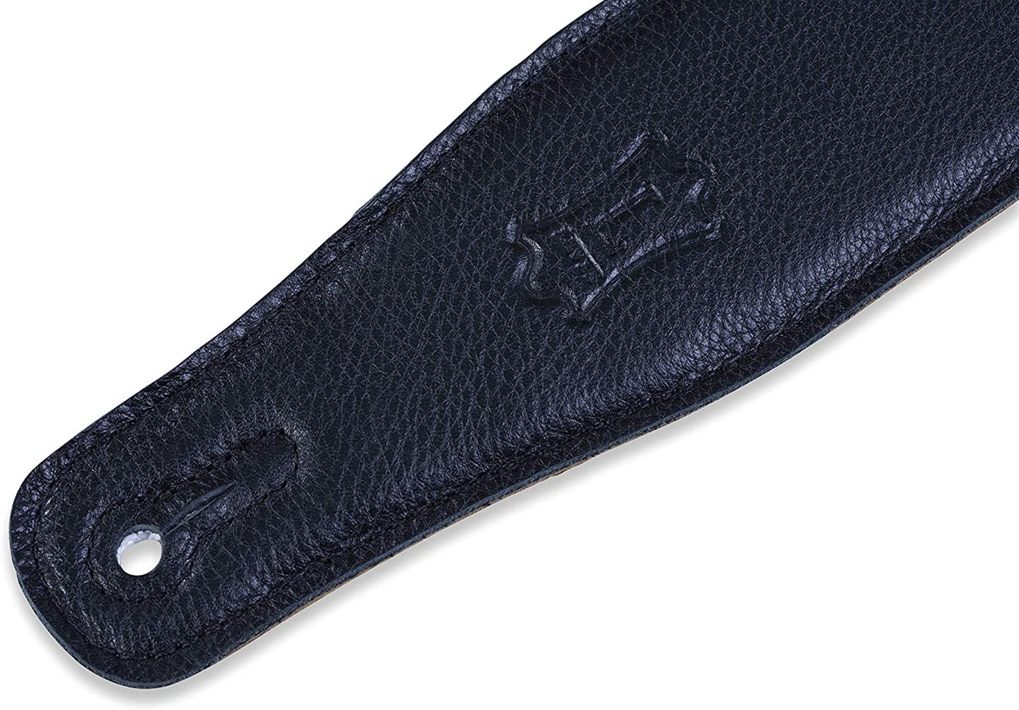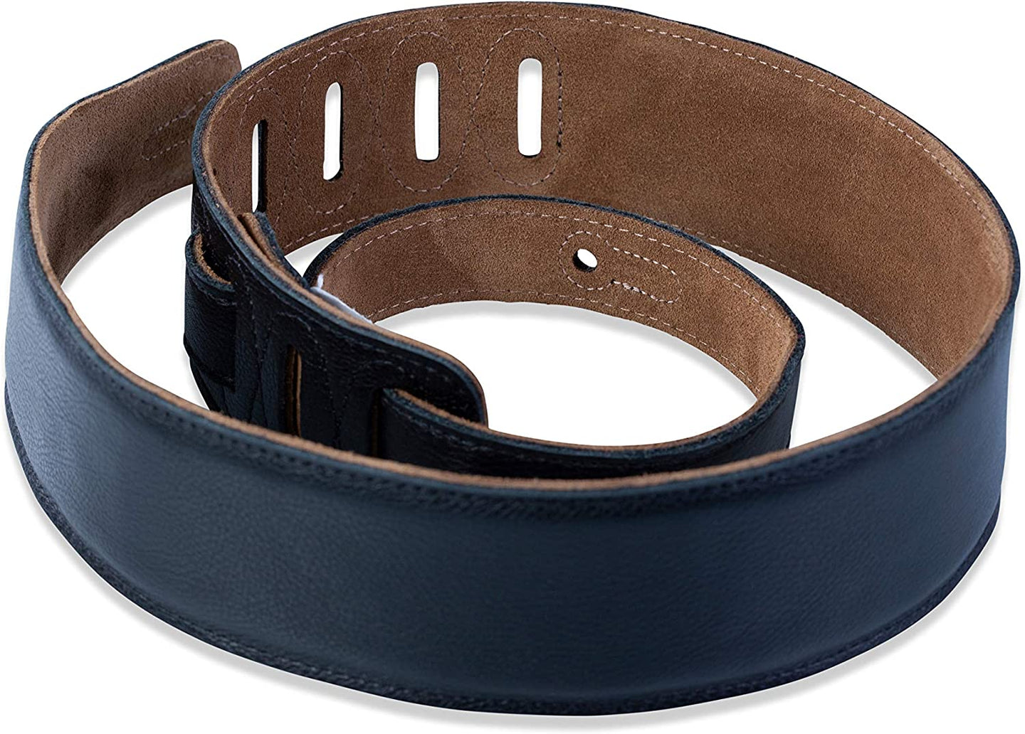 2 1/2 inch garment leather guitar strap with foam padding and suede backing. Adjustable from 38 inches to 53 inches. Also available in extra long (XL), which adds 12 inches to overall length.
