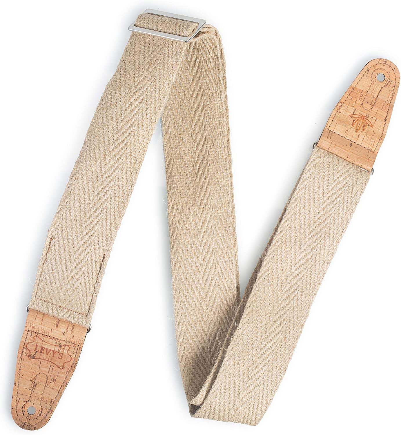 Vegan and made from sustainable materials, these woven hemp guitar straps feature soft 2-ply cork ends with reinforced stitching and Levy's logo.