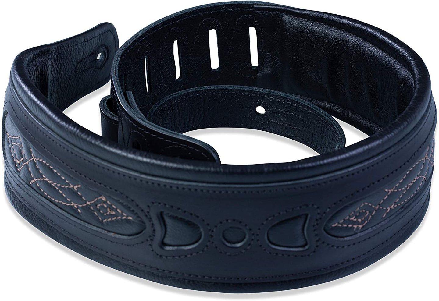 3″ veg-tan leather guitar strap with contrasting garment leather windows, foam padding, and garment leather backing. Adjustable from 37″ to 50″. Also available in extra long (XL), which adds 12″ to overall length.