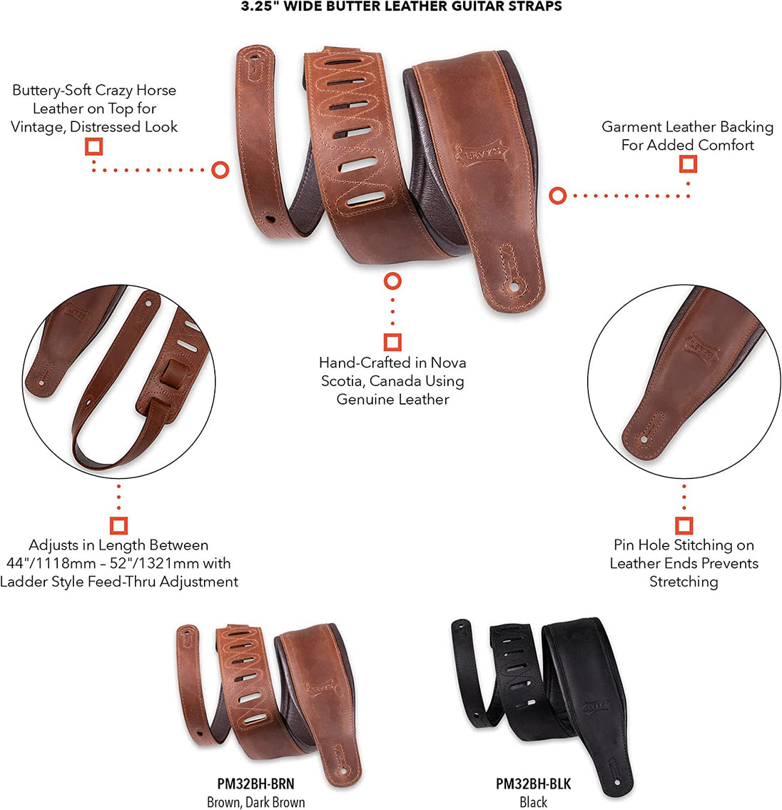 For better or worse, most gigs tend to run longer than an hour. And no matter how heavy (or light) your guitar, its weight tests your stamina the longer you strum away. At Levy’s, we deliver premium leather guitar straps that offer unmatched comfort and style. Our 3.25”-wide butter leather straps are a great example. The PM32BH straps feature a fitted, comfortable layer of garment-leather backing to keep you relaxed and focused on what matters most – your performance. And because most things musical improve with age, we’ve also included a smooth layer of Crazy Horse leather on the top to weather the typical scratches and scars acquired from general use, resulting in a distressed appearance that will surely attract attention from your admiring audience.