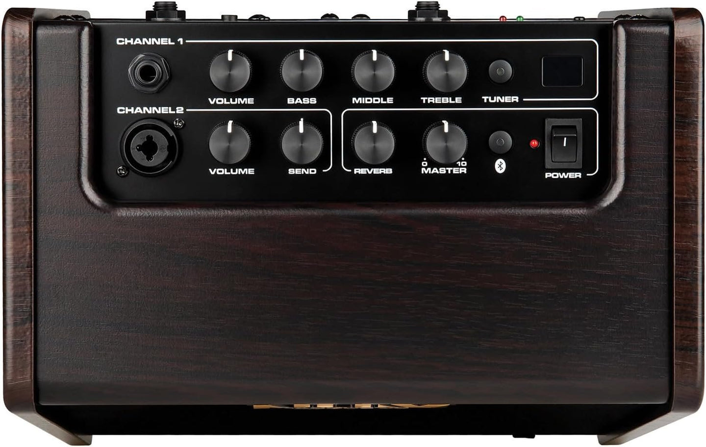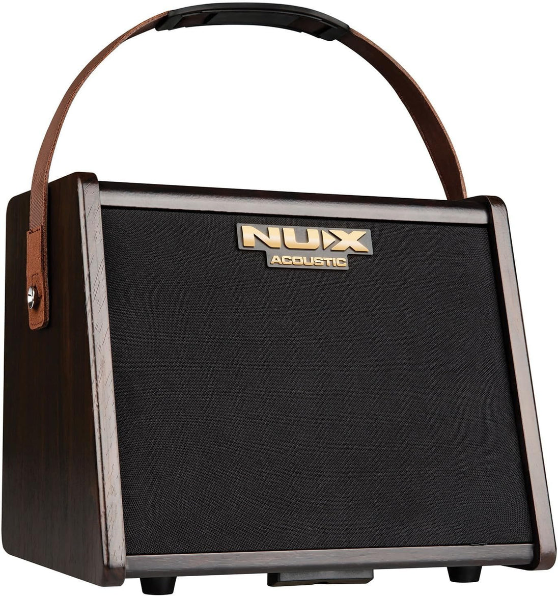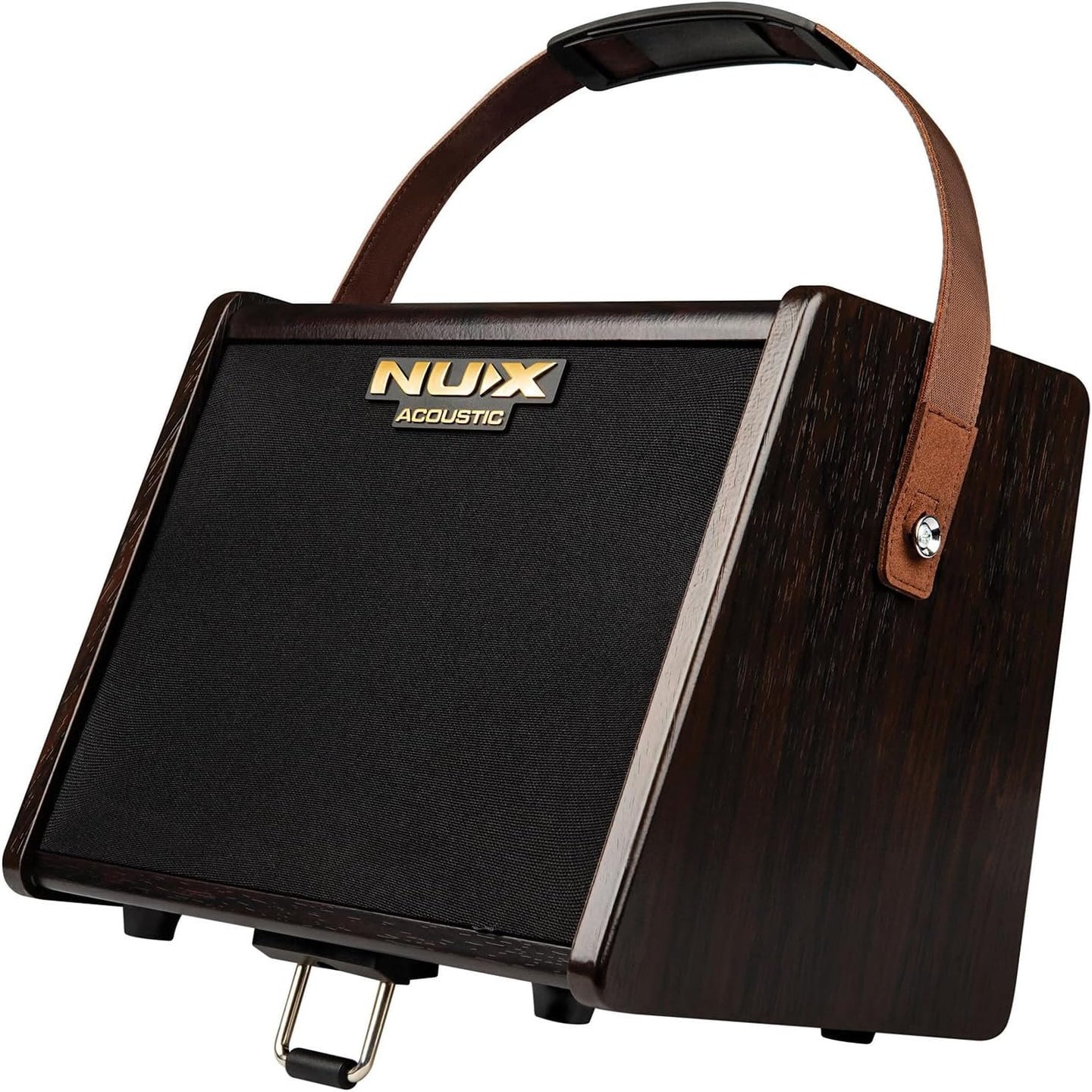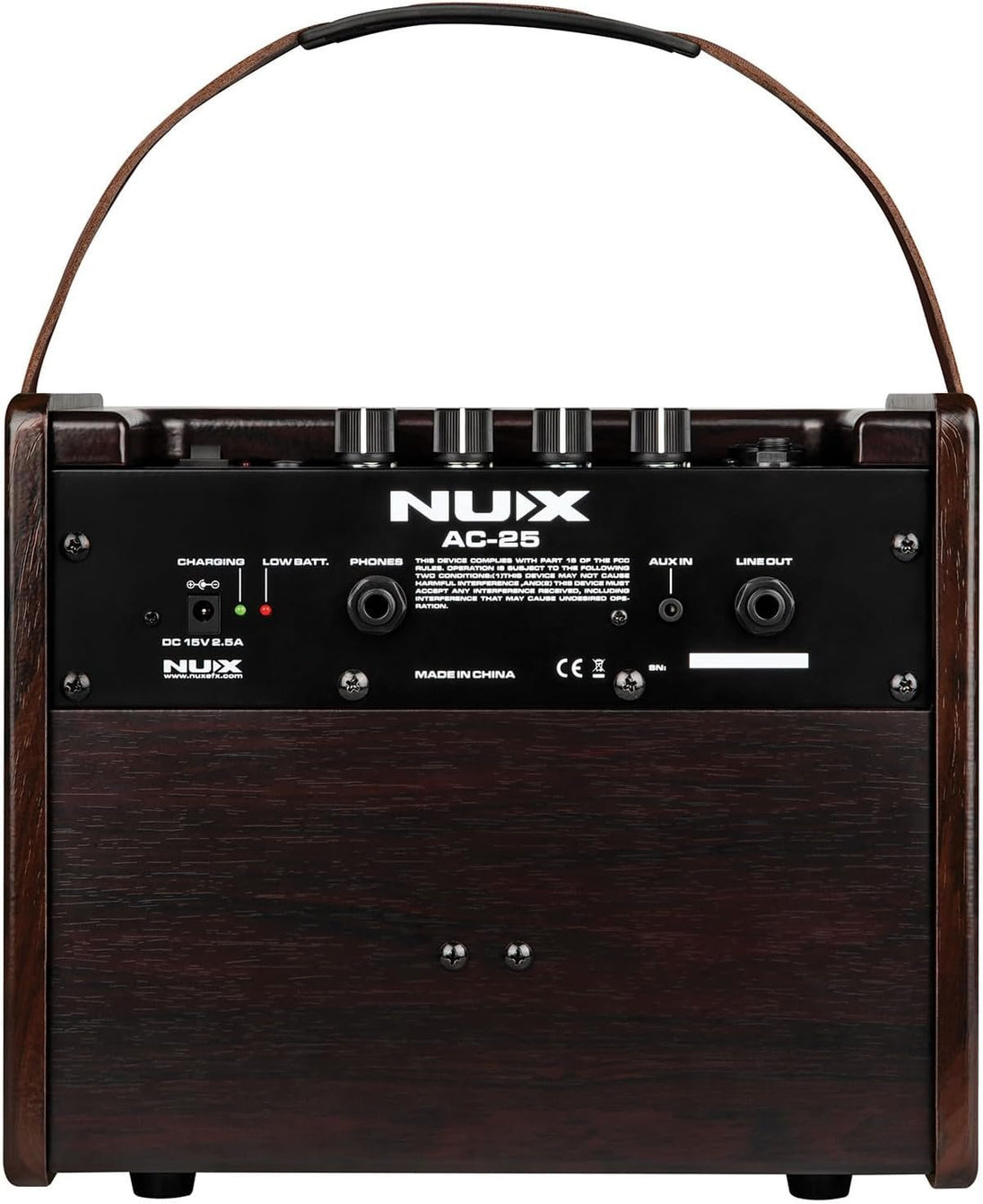 NUX AC-25 is a compact acoustic amplifier with built-in rechargeable battery that can run 4 hrs for busking. It equips a 6.5″ speaker, Modeling Preamps, Reverb, Bluetooth Audio Stream, Drum Machine. You can tweak it through Stageman APP on the mobile phone. The dual channel configuration means you can plug a dynamic mic and your acoustic guitar. You can play playbacks via Bluetooth Audio Stream, or auxiliary input. Let’s busk on the streets!