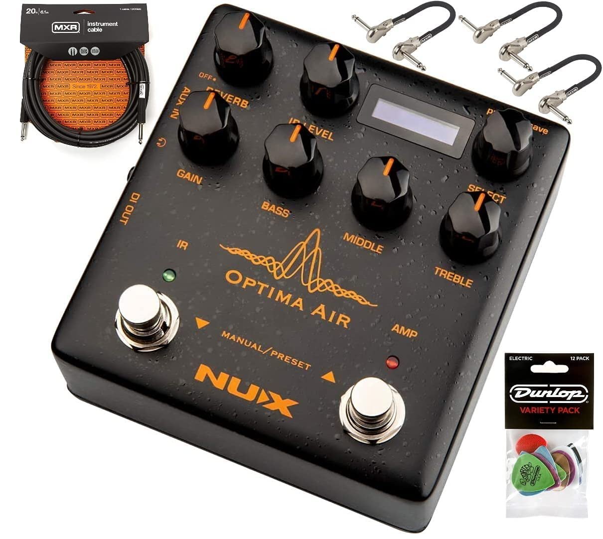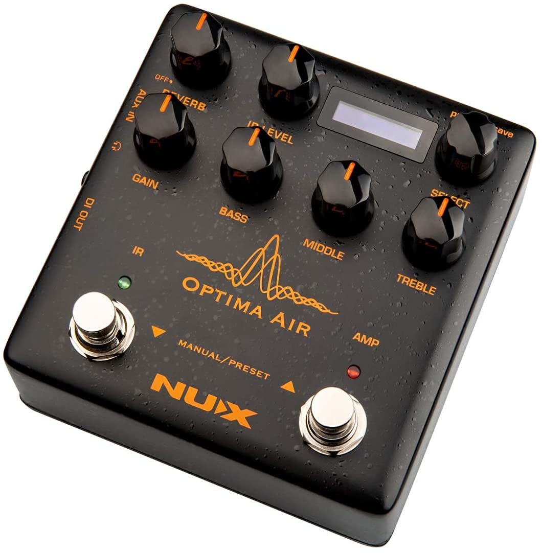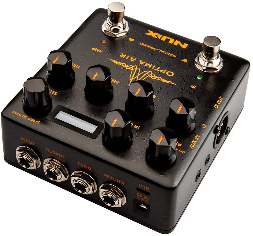 Control Panel Reverb: One Knob Reverb effect control. It adjusts the Dry/Wet and Decay parameters. Or you can turn it OFF by tweaking to 0. IR Level: Adjusts the simulated signal (Impulse Response file) LEVEL. Select (Push to Save): In manual mode, you can choose the IR file. And you can save your customized preset by pushing the knob. Gain: Adjusts the signal input Gain level. 3-Band EQ: Bass: Adjusts the low frequency level Middle: Adjusts the middle frequency level Treble: Adjusts the high frequency level. IR Footswitch: Manual Mode: Engage/disengage the selected IR file. Acoustic guitar simulation ON/OFF Preset Mode: Bank DOWN. AMP Footswitch: Manual Mode: Activates the pre-amp section. When you engage the AMP, you can use the Gain and the 3-band EQ. Preset Mode: Bank UP. Input/Output Jack Input: 6.35mm (1/4-inch) jack input Output: 6.35mm (1/4-inch) jack output Send/Return: 6.35mm (1/4-inch) effect loop inputs Micro B USB Port: You can connect the pedal to your computer to use the Optima Air software to create, edit and save your presets. And update the pedal when a new firmware released. Power Input: 9V Negative TIP power adapter input 3.5mm (1/8-inch) Auxiliary Input: You can connect music player to play along with music 3.5mm (1/8-inch) Headphones Output: For silent practicing or recording XLR DI Output: For direct connection to mixer (or PA system) Specifications .24-bit, 48-kHz Sampling Quality .Acoustic Guitar Impulse Response and Pre-Amp controls .15 built-in acoustic guitar profiles with IR level control .9 Preset Slots .Reverb Effect .Gain, Bass, Middle and Treble controls .6.35mm (1/4-inch) Send/Return, effects loop / 3.5mm (1/8-inch) Auxiliary input / 3.5mm (1/8-inch) Headphones input .XLR DI Out / Micro B USB Port for USB Audio Stream and Edit SoftwareComes bundled with 3 MXR patch cables, 20ft MXR instrument cable, and Dunlop PVP113 pick packIt simulates the acoustic guitar profiles with the best-optimized sound depending on your guitar and pickup type.IR loader combined with a preamp which is equipped with 3-band EQ and Gain controls.A unique profile capture function, you can create your own acoustic guitar profile (IR file) by capturing your favorite acoustic guitar's sound.XLR DI output for direct line/mixer connection, headphones output for silent play and auxiliary input to connect a music player to play along.You can load 3rd party IRs and edit preset names through editor software. Update the firmware from NUX official Website after you get this pedal.