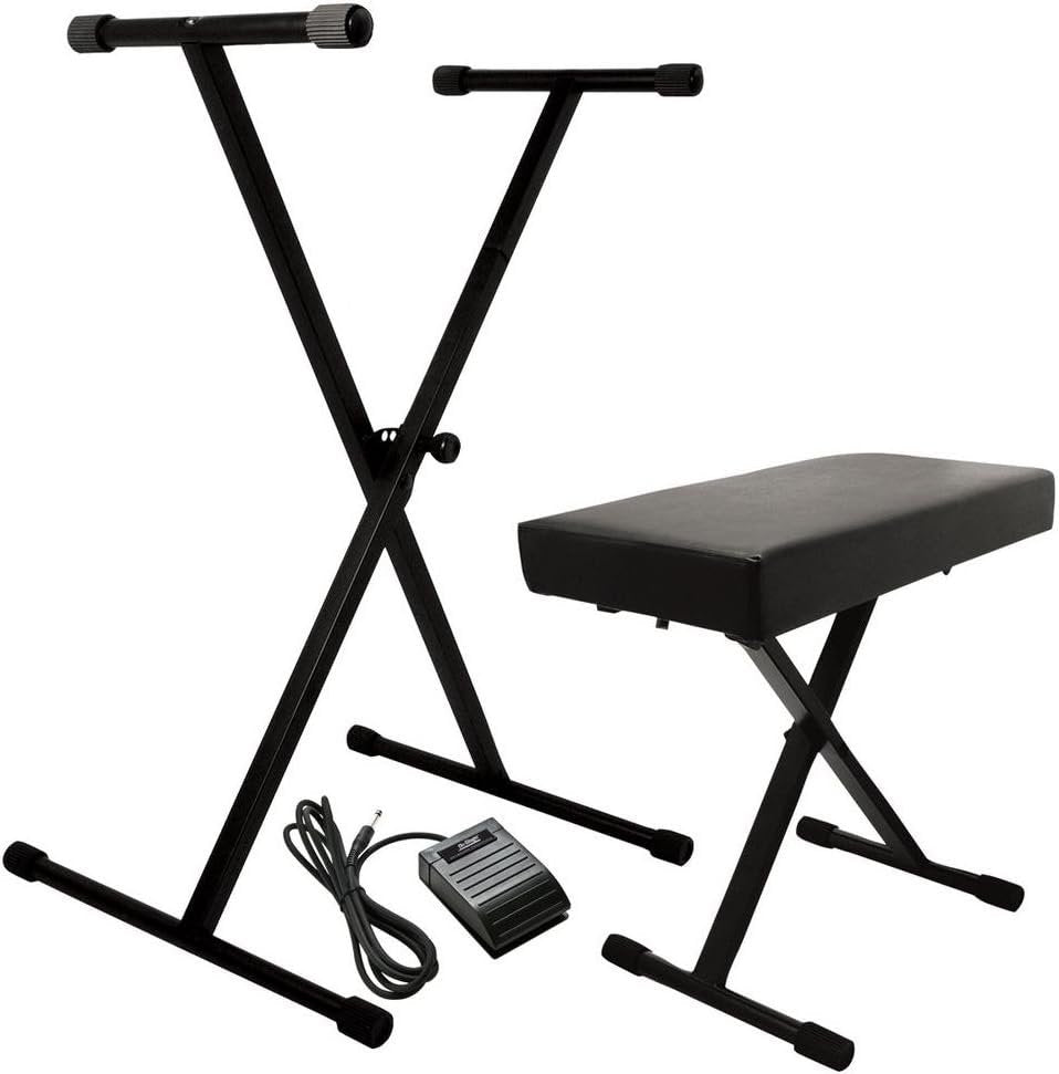 The KPK6520 CB Keyboard Stand and Bench Pack with Keyboard Sustain Pedal bundles three of our most popular keyboard accessories—an adjustable stand, a deluxe bench, and a sustain pedal—for an exceptional value. Our KS7190 Single-X Keyboard Stand provides a wide, stable base and slip-free support for small-format keyboards. This versatile stand adjusts in height and length to suit various keyboard sizes and playing styles and features adjustable nonslip arm sleeves to accommodate a variety of keyboard widths. The entire stand folds flat for convenient storage and transportation. Designed for ergonomic playing, our KT7800 Three-Position X-Style Keyboard/Piano Bench features a soft yet firm seat cushion that delivers outstanding comfort and support. The exceptionally stable base adjusts in height to accommodate a variety of playing styles. The base also folds flat for convenient storage and transportation. Our compact KSP20 Keyboard Sustain Pedal enables the use of your foot to activate the sustain function on any electronic keyboard with a 1/4" sustain jack. Designed for ease of use and convenient set up, this pedal features an integrated 6' cable, treaded top for foot traction, and nonslip rubber feet to keep it in place on the floor.