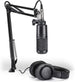 The pack includes an AT2020 cardioid condenser microphone, a pair of ATH-M20x professional monitor headphones and a studio boom arm threaded with a XLR cable. The adjustable studio boom arm clamps securely to desks, tables and other flat surfaces up to 55 mm (2.2") thick. The boom is equipped with a standard 5/8"-27 thread for easy attachment of the included pivoting microphone stand mount, and the XLR cable is threaded internally for a clean appearance and unhindered operation. Offering full 360 degree rotation and adjustable, spring-stabilized joints, the boom arm repositions quickly for optimal mic placement.