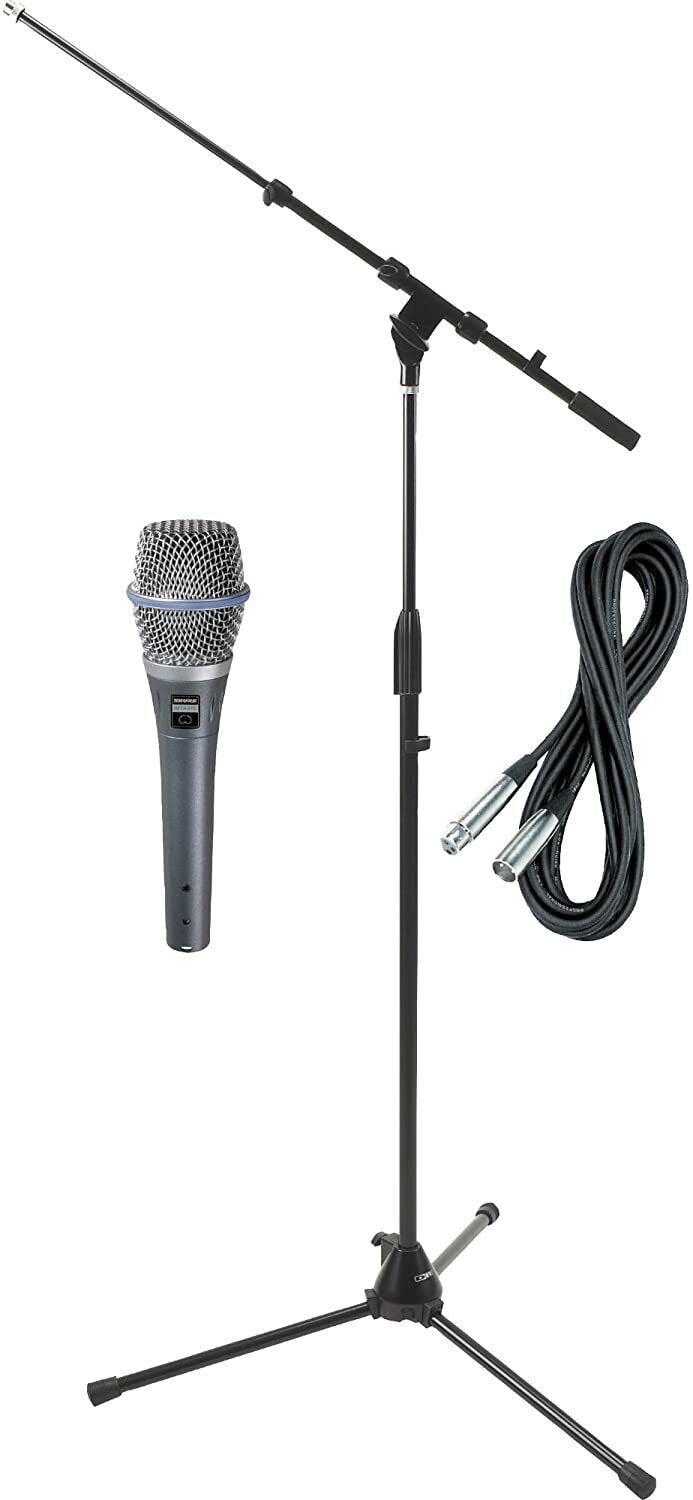 The Beta87-C premium vocal microphone delivers studio-grade performance and a smooth, extended high-end frequency response in a cardioid condenser design. The microphone adds warmth to the frequency response and creates an ideal environment for in ear personal monitoring. And its highly consistent cardioid pattern offers excellent rear rejection. FEATURES:- Smooth, wide frequency response with slight presence rise.- Uniform cardioid polar pattern for maximum isolation.- Minimum off-axis tone coloration.- Low-frequency roll-off compensates for proximity effect.- Three-stage pop filter minimizes breath pop and noise.- Break-resistant stand adapter.Bundle Includes:- Shure BETA87-C Cardioid Condenser Microphone for Handheld Vocal Applications- Tubular microphone mic stand with boom included- Hot Wires Microphone Cable