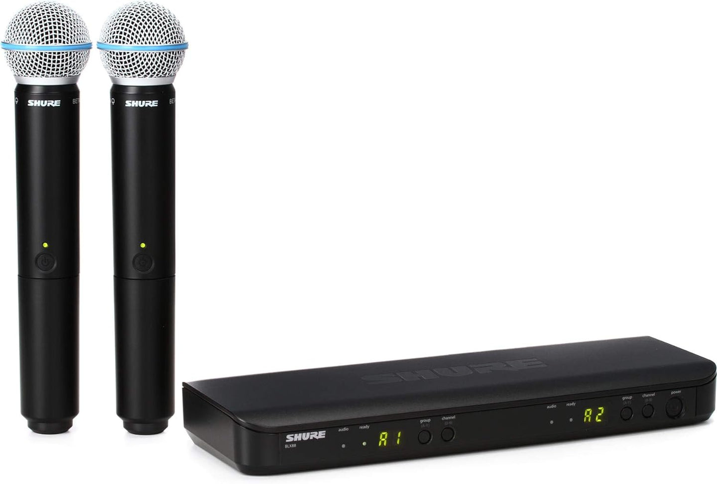 WHAT'S IN THE BOX - BLX88 dual-channel receiver, power supply, 2x BLX2 handheld wireless transmitters with integrated BETA 58A vocal mic capsules, 2x mic clips, 4x AA batteries (2x for each transmitter), and user guide. Free 2-YEAR WARRANTY included.